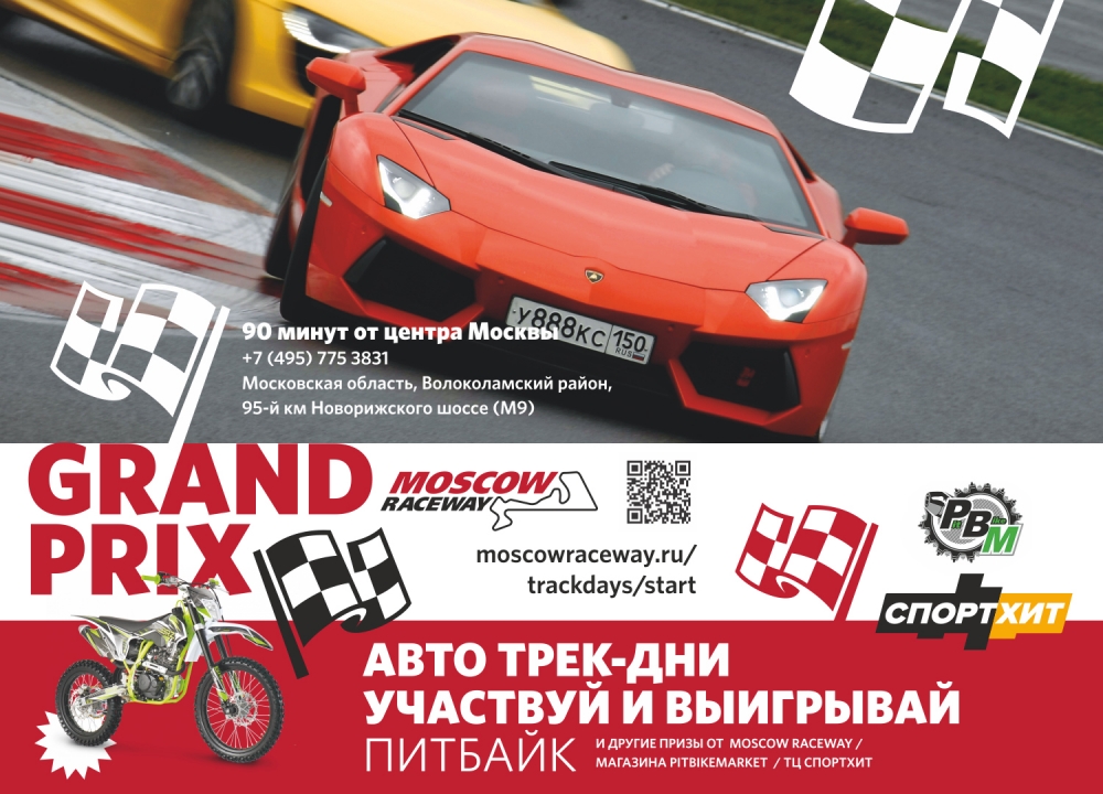 На Moscow Raceway вновь стартовали автомобильные трек-дни - любителей покататься ждут 14 и 15 мая с 10 до 20.00. На трассе постоянно работает кафе с домашней кухней, доступна аренда боксов и транспондеров. Последний особенно пригодятся тем, кто планирует принять участие в Гран При Moscow Raceway - сезонном соревновании на самые стабильные результаты. Не важно, какую скорость развивает ваша машина - шанс на победу есть у всех, поскольку она зависит от ваших умений, а не возможностей автомобиля. Для того, чтобы стать участником Гран При, нужно всего-навсего сообщить о своем желании на регистрации. Главный приз - питбайк - будет вручен победителю в конце сезона.